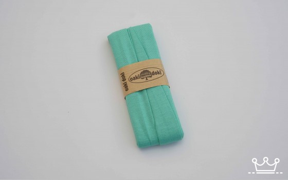Tricot biaisband van het merk Oaki Doki, is samengesteld uit Viscose en Elastan. Het heeft een fijn geweven structuur en voelt heel zacht aan. Het is decoratief toe te passen op veel rekbare stoffen, vooral voor mouw- en halsopeningen.