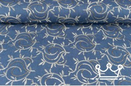 Dit is een bijzondere denim/spijkerstof stof geborduurd met witgoud-kleurig garen. de bladeren zijn niet alleen geborduurd maar bevatten daarnaast ook goudkleurige pailletten voor een super mooie uitstraling.