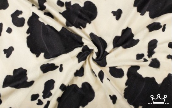 Dierenprint Koe Zwart is een mooie kwaliteit Velboa. Het is een kortharige velours/nep bont. Het is dus een harige stof met een luxe uitstraling. Deze stof is gemaakt van 100% polyester en wordt machinaal gemaakt. Deze stof wordt speciaal gebruikt voor het maken van: kleding, kussens, decoratief of als bekleding voor bijvoorbeeld een hondenmand. Ook bij het theater of bij de carnaval zien we deze stof regelmatig terug.