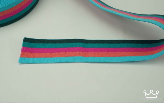 Elastiek 32mm gestreept blauw, petrol, bottle, roze. Dit elastiek is gemaakt van 895% Polyesther 5% Elasthaan. Dit elastiek is 32mm breed