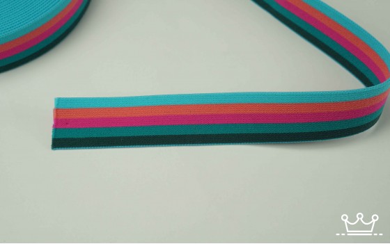 Elastiek 25mm gestreept blauw, petrol, bottle, roze. Dit elastiek is gemaakt van 895% Polyesther 5% Elasthaan. Dit elastiek is 25mm breed