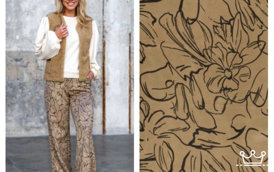Deze stof is een mooie bedrukte soepele en rekbare imitatie suède stof voor het maken van kleding zoals jasje, jurk of rok of als decoratie.