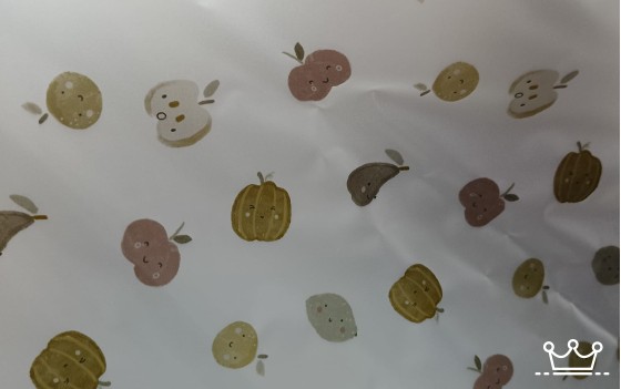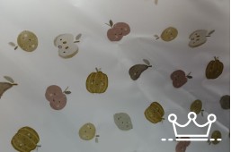 Vrolijke transparante regenjas-stof bedrukt met een speelse print van fruit. Deze stof is ideaal voor creatieve, waterdichte projecten zoals regenjasjes, poncho’s, tasjes, slabben, schorten of fietsaccessoires voor kinderen.
